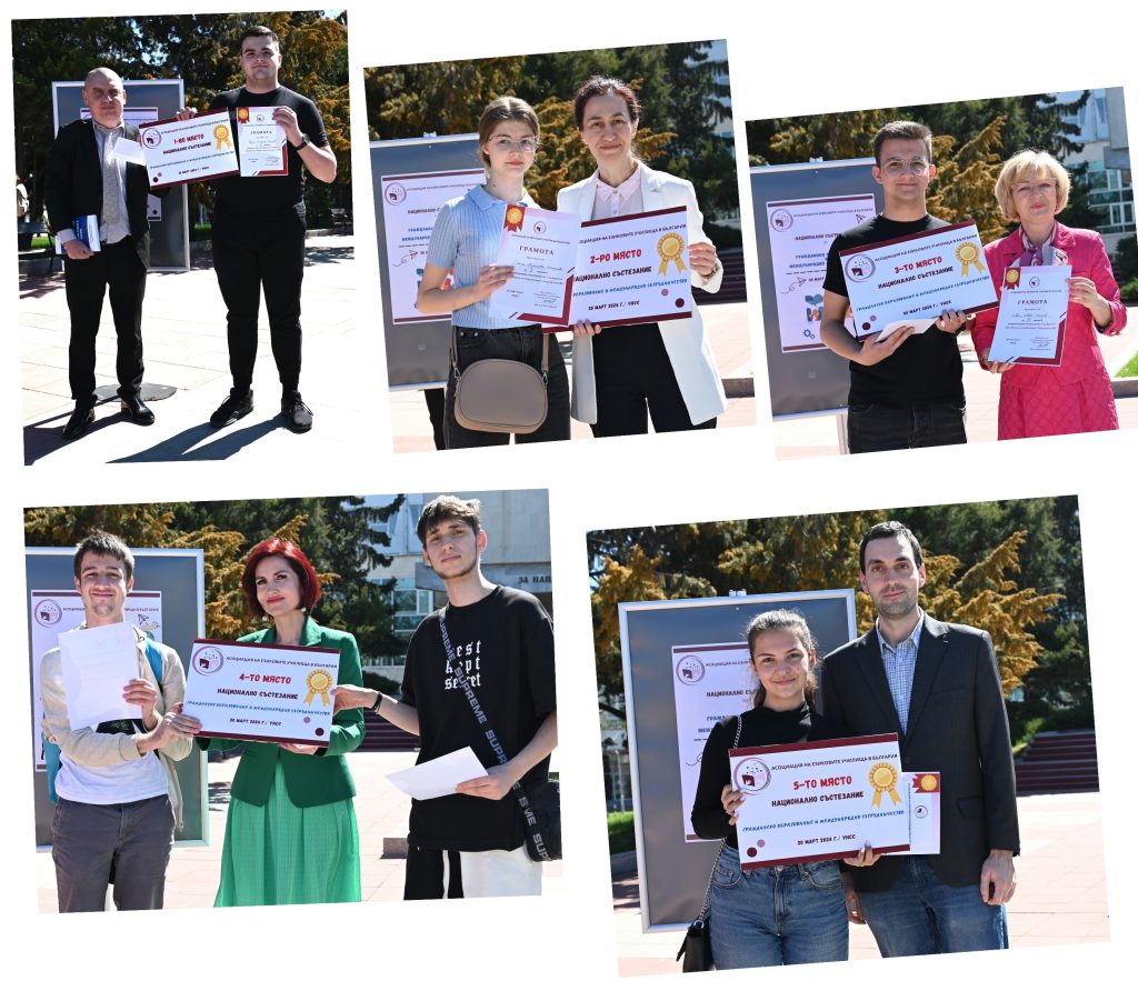 Асоциацията на езиковите училища в България (АЕУБ) проведе на 30.03.2024 г. своето първо състезание по „Гражданско образование и международно сътрудничество“ в Университета за национално и световно стопанство. Дванадесетокласници от езикови гимназии и гимназии със засилено изучаване на чужди езици от различни градове в страната се явиха на състезанието. На лауреатите се признава отлична оценка за прием в УНСС в специалностите на факултет „Международна икономика и политика“.