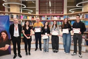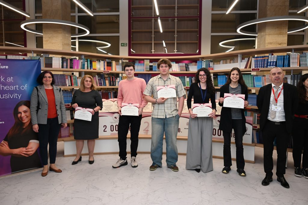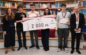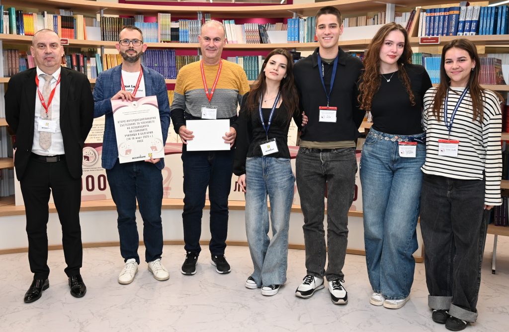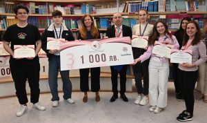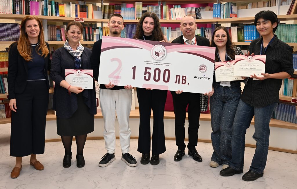 Г-жа Цветомира Христова от Аксенчър България и доц. Васил Петков (в средата) и отборът на Езикова гимназия „Д-р Петър Берон“