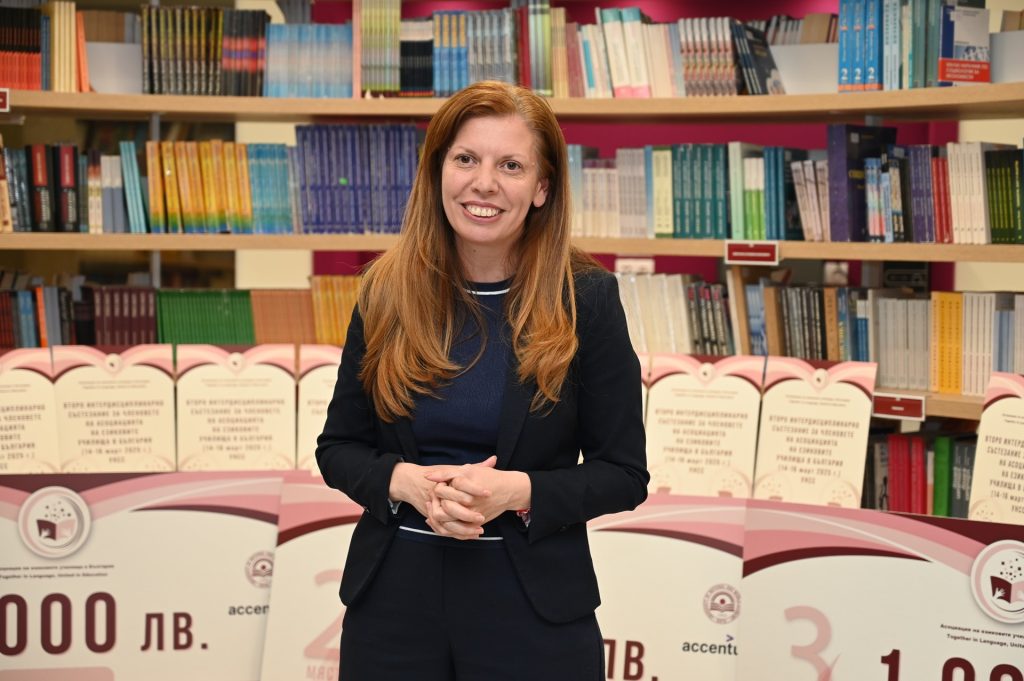 Г-жа Цветомира Христова от Аксенчър България и отборът на Първа английска гимназия